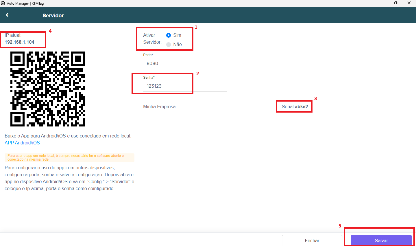 3- Em "Ativar Servidor" coloque "Sim" (1) e preencha uma senha (2). Antes de clicar em "Salvar" (5), anote o "Serial" (3) da empresa que deseja fazer a conexão (obs: será necessário deixar o serial exatamente como exibido nesta tela, sem espaços e letra maiúsculas ou minúsculas), anote também o "IP atual" (4) (Atenção o ip é do servidor caso esteja utilizando ip automatico ele pode mudar, verifique também se o servidor PC e outros dispositivos que esta tentando conectar estão utlizando o mesmo roteador e se tem conexão entre si). Por ultimo é só clicar em "Salvar" (5). Com isso o app ira reiniciar sozinho e o servidor já deve estar ativado. (Para testar se a conexão está ativa você pode abrir o navegar digite o ip seguido de dois pontos ":" e o número da porta "8080". Ex 192.168.1.104:8080. Deve aparecer a mensagem "server on")