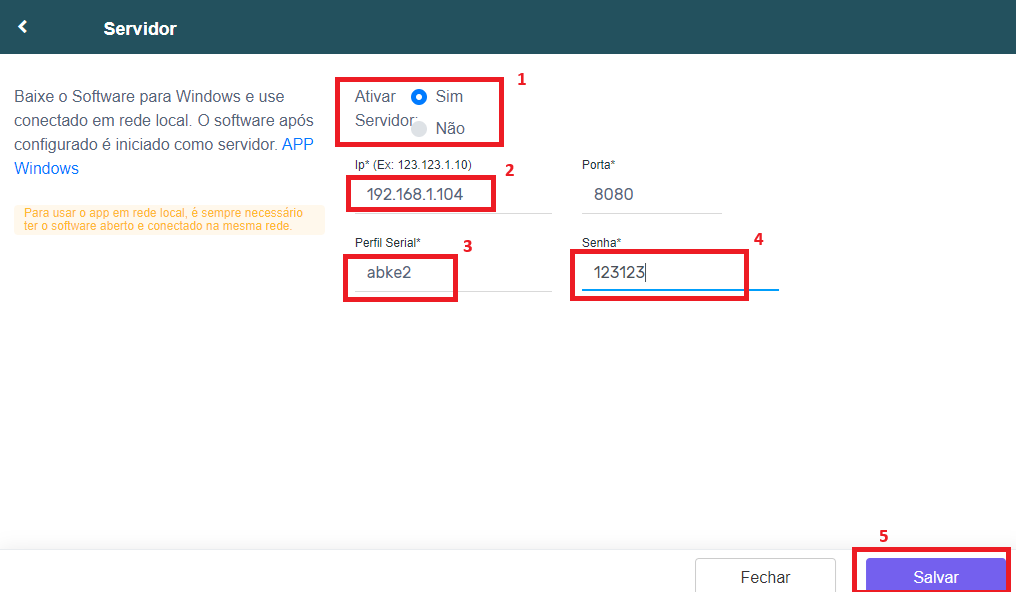 6 - Em "Ativar Servidor" (1) mude para "Sim", preencha o Ip (2) conforme é o IP do servidor (não esqueça de colocar os pontos (.) entre os números), preencha o "Perfil Serial" (3) conforme aparece no servidor (deixe exatamente igual, sem espaços e respeitando letras maiusculas e minusculas), preencha a "Senha" (4) (deixe exatamente igual, sem espaços e respeitando letras maiusculas e minusculas), no final clique em "Salvar" (5). O app testará a conexão com o servidor caso de tudo certo o app será reiniciado e depois já estara conectado ao servidor. Caso apareça uma mensagem de erro verifique os dados preenchidos, e se o servidor esta ligado e utilizando o mesmo roteador que o app que está tentando conectar.